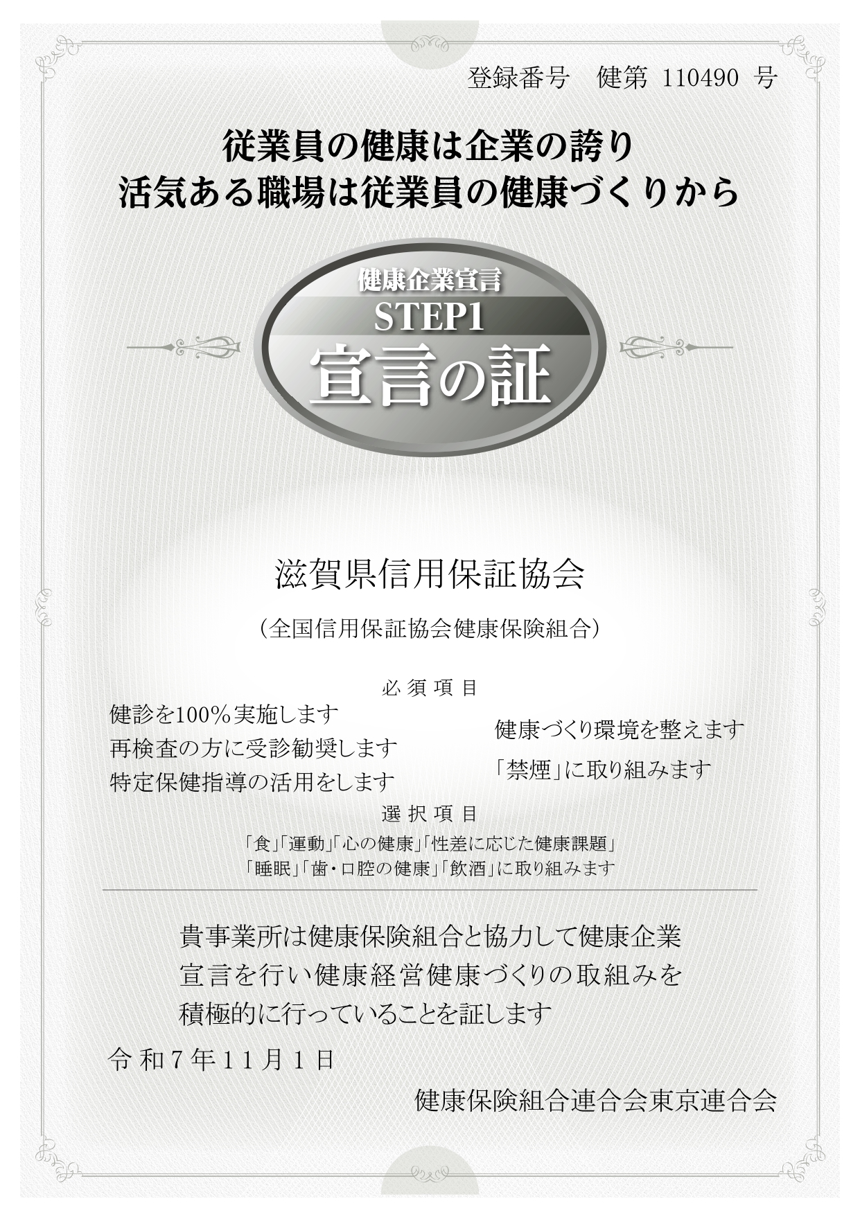 当協会は、役職員の健康保持・増進を通じて、生産性の向上や活気ある職場環境の醸成を図ることを目的に、令和 7 年11月1日付で「健康企業宣言※」を行いました。
